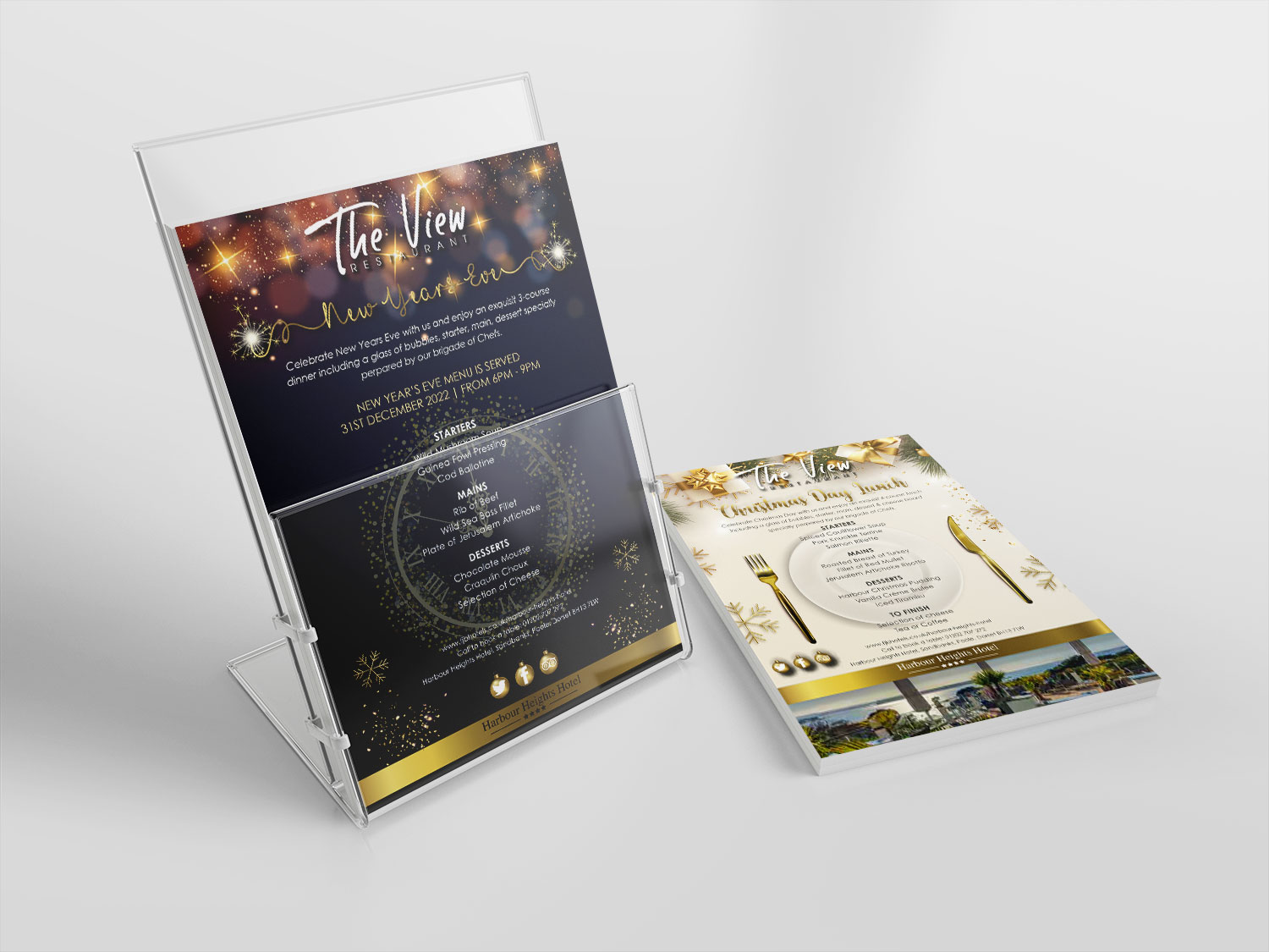 An A5 double sided leaflet design created to advertise 'The View' restaurant within The Haven Hotel, Sandbanks in Poole.