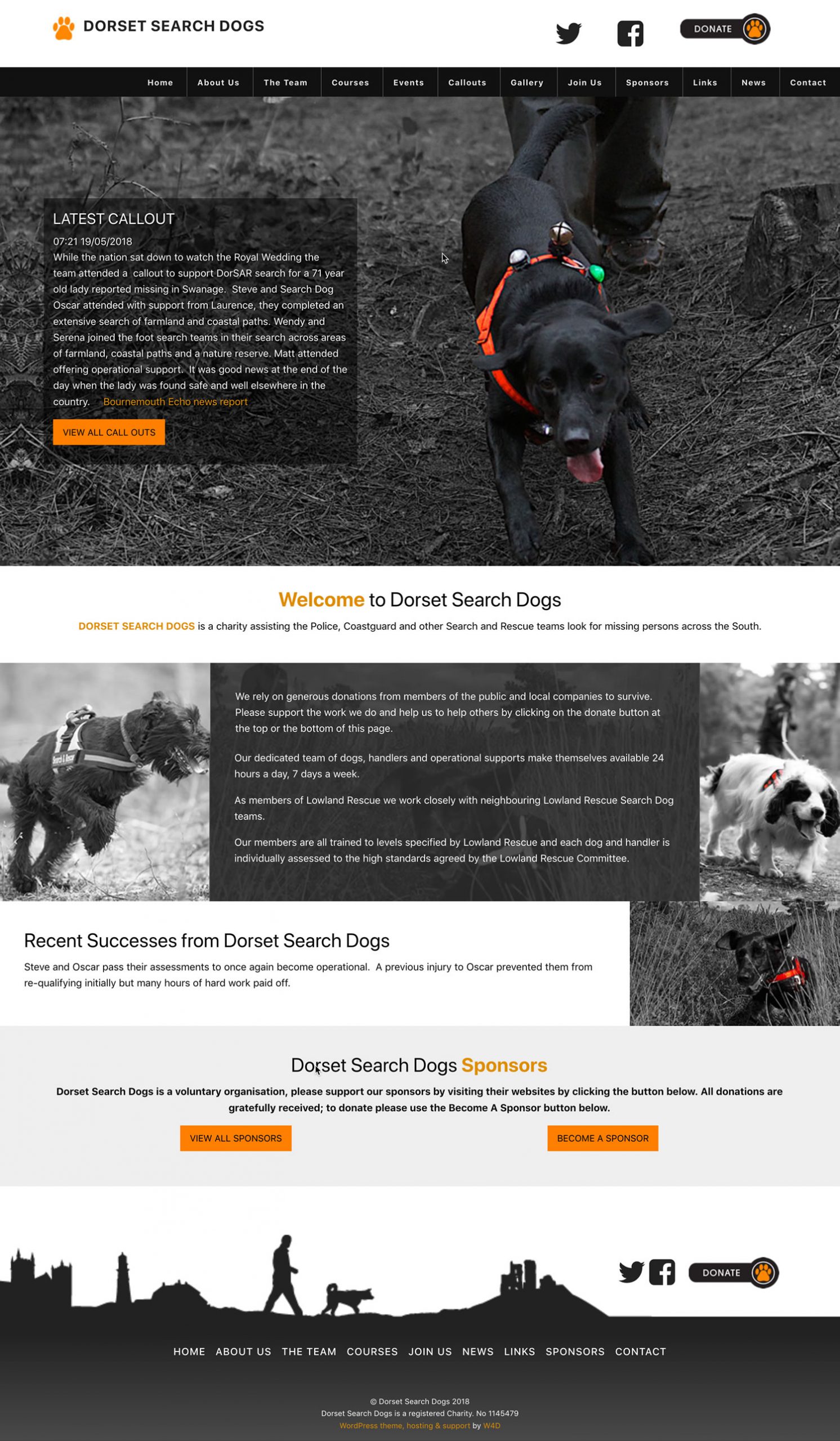 Laurence had taken a few monochrome stylised photos which I thought would work well as a starting point for their new website theme. So a monochrome design with a pop of orange was created to reflect the photos Laurence had taken and also worked well as the working search dogs harnesses are orange in colour for easy visual location when working in the field. I designed a footer to show a selection of famous Dorset landmarks and incorporate a dog and handler. This is the final website design build in WordPress by creation of a custom theme which is fully updateable and responsive.