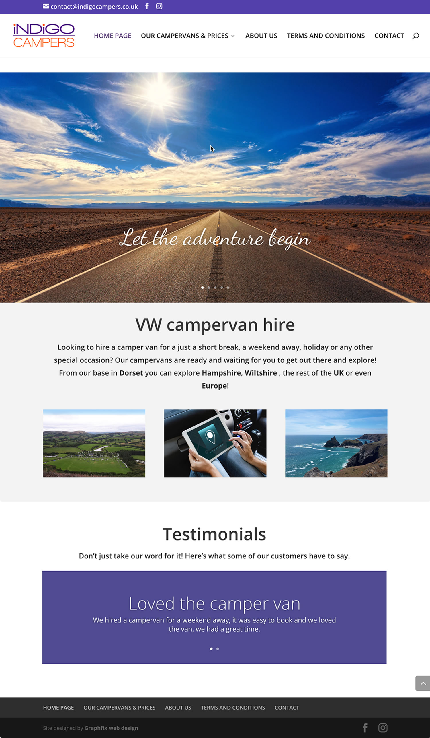 Ali and Rob from Indigo Campers based in Poole, Dorset needed a website for their campervan hire business. The site needed to showcase each of their 3 campervans. The user needed to be able to see available booking dates, and also allow them to make bookings online.